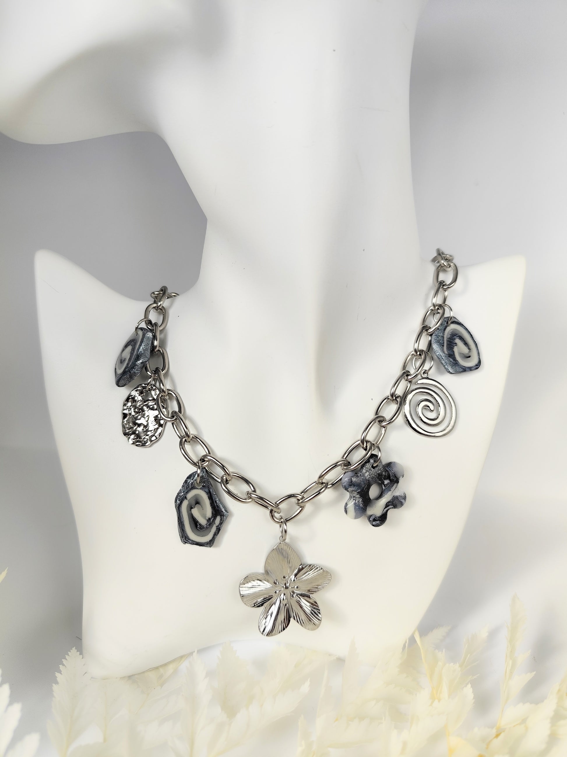 Collier crée avec des breloques en pâte polymère fait main ainsi que des breloques argenté.