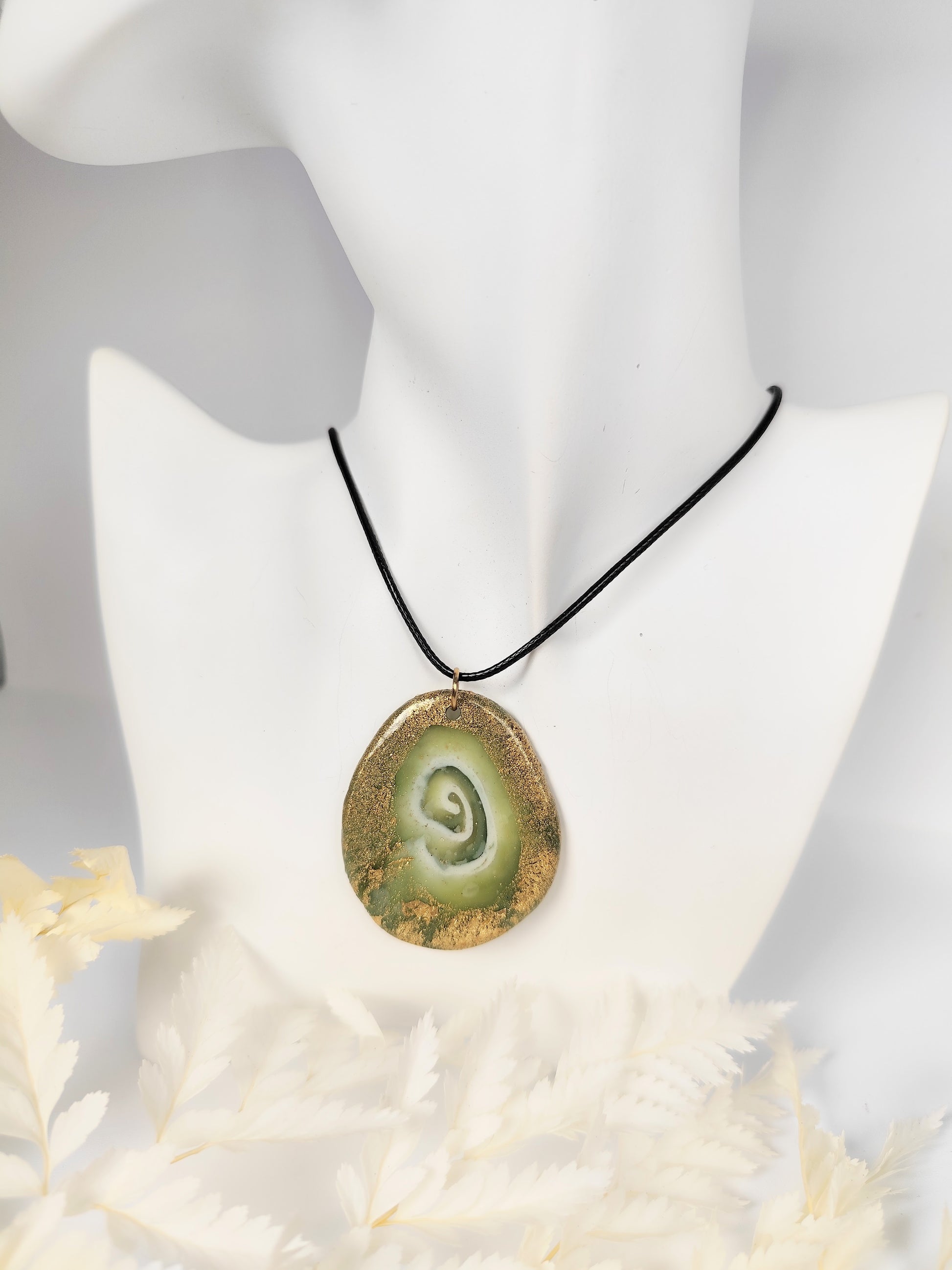 Collier en pâte polymère façonné à la main, finition vernis brillant. Cordon ciré noir.