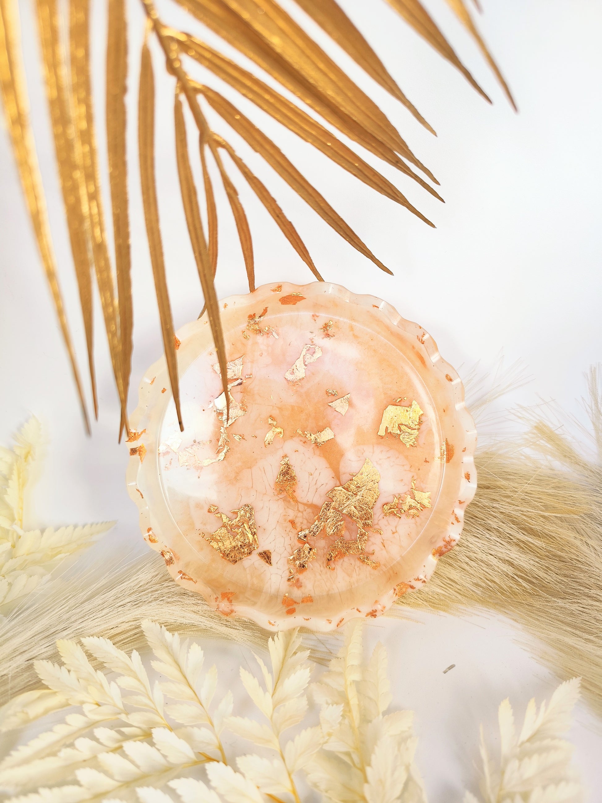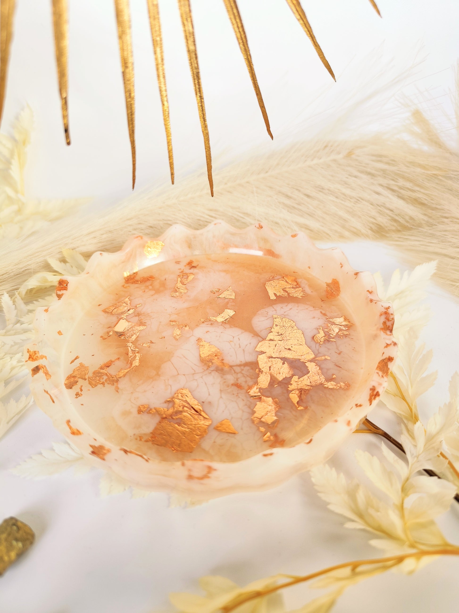 Plateau porte bijoux rond en résine époxy de couleur beige nacré/ feuille d'or orangé.