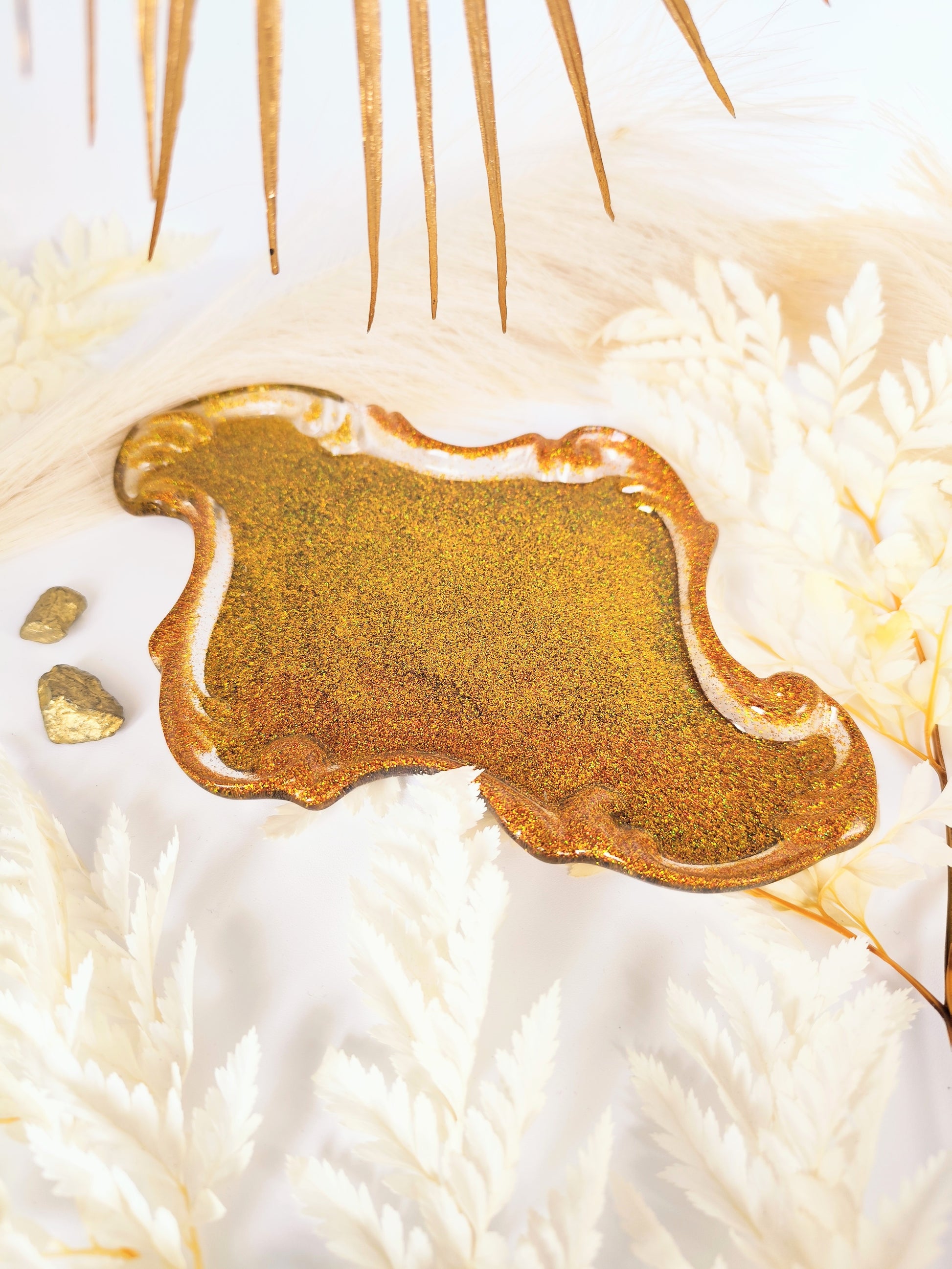 Plateau porte bijoux vintage en résine époxy de couleur doré/pailleté