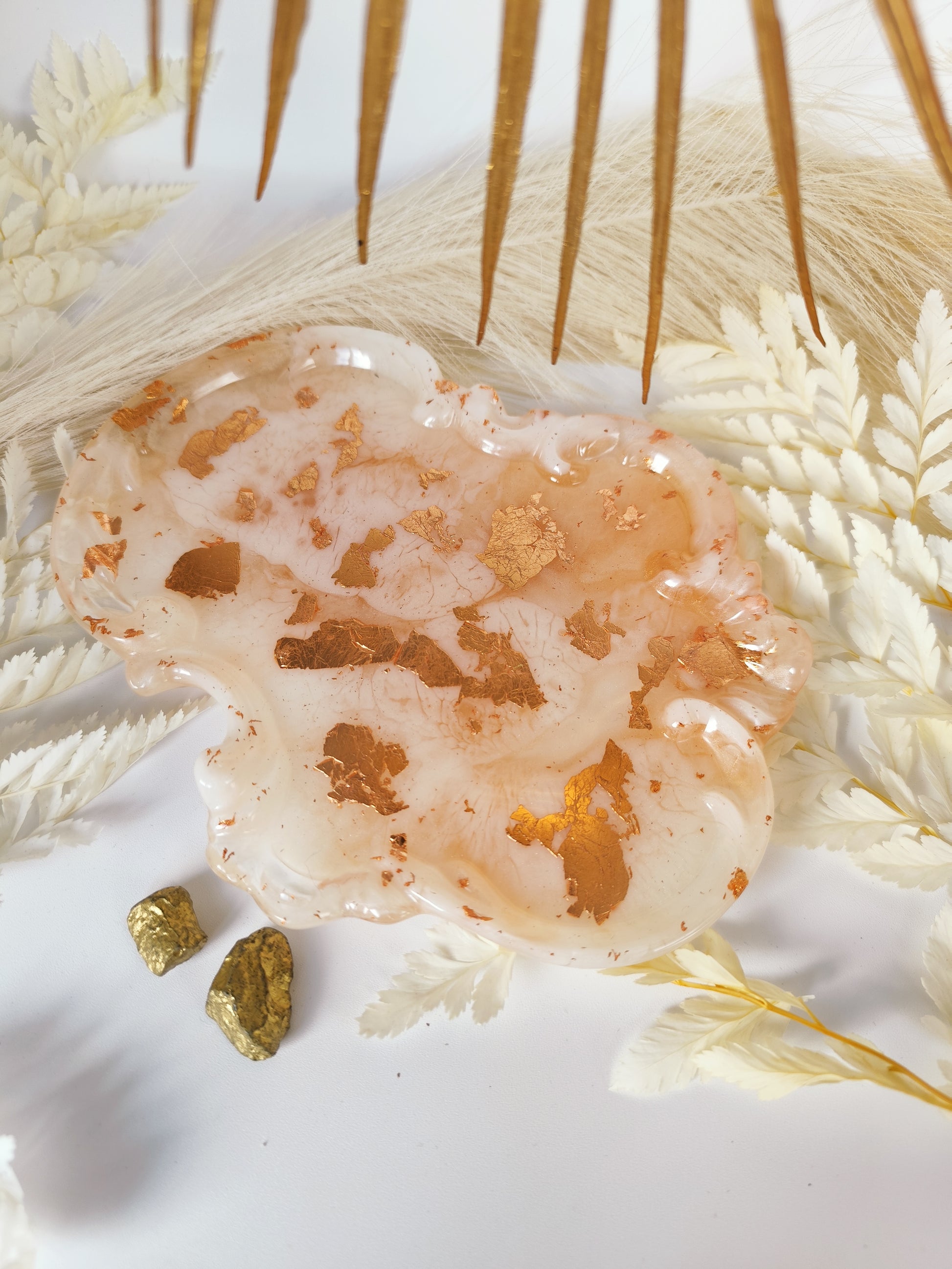 Plateau porte bijoux vintage en résine époxy de couleur beige nacré/doré
