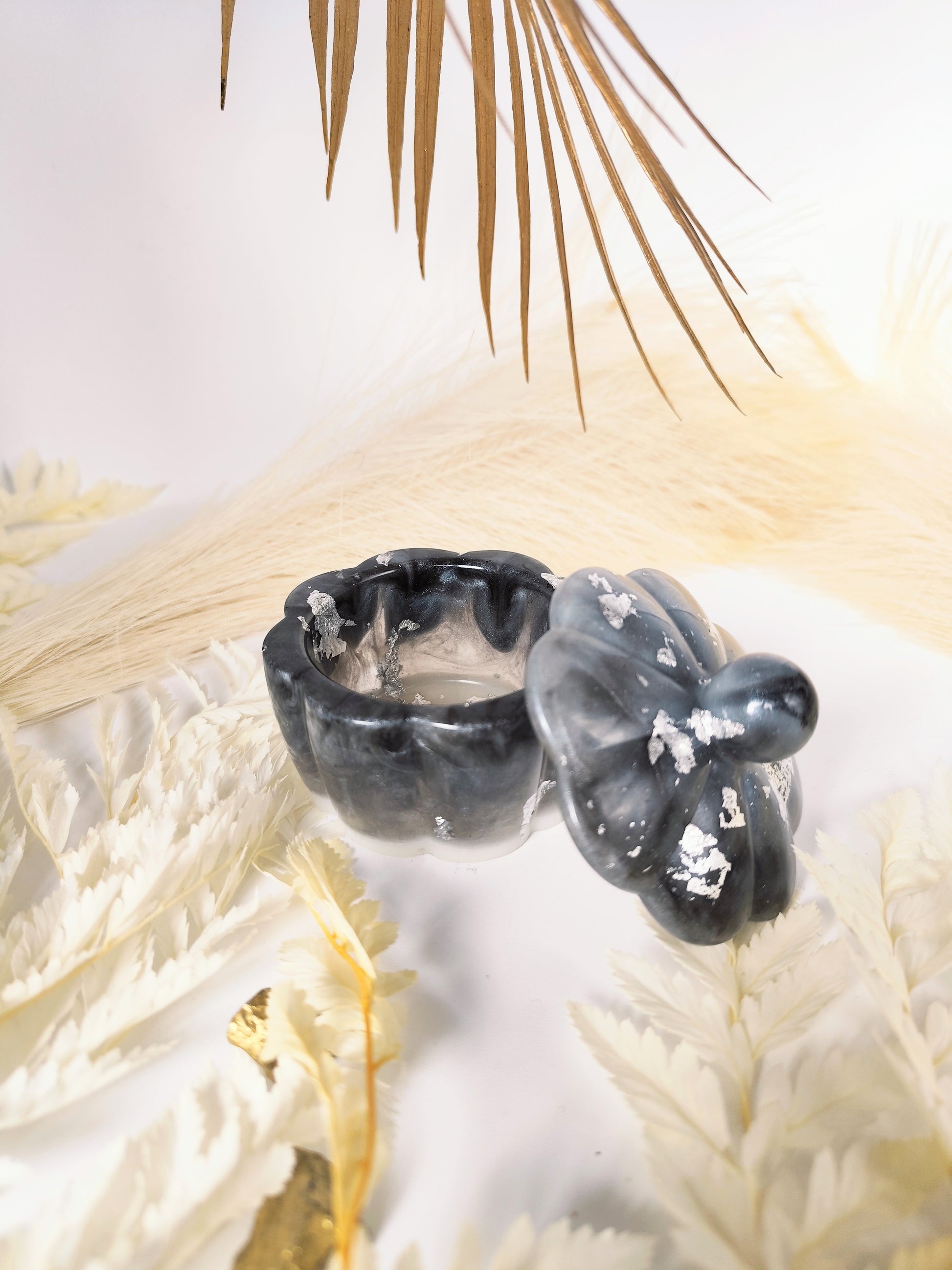 Pot à bijoux avec couvercle en résine époxy de couleur gris/argenté.