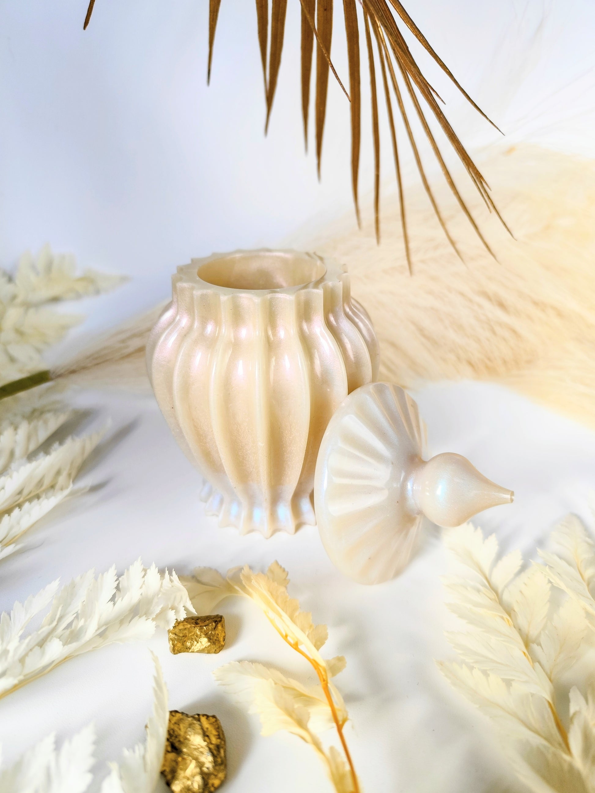 Pot multi usage avec couvercle beige nacré en résine époxy.